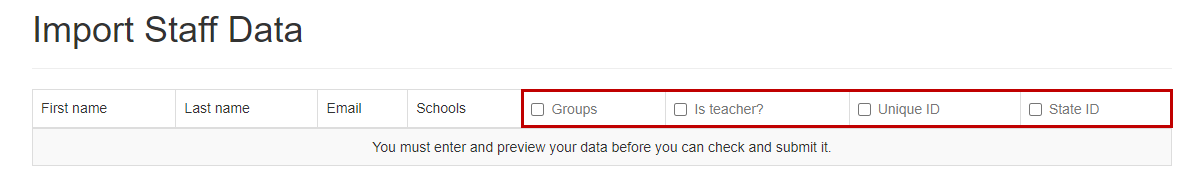 On the Import Staff Data page, select each type of optional information field to be imported for the accounts by checking the box next to each included option within the CSV file.