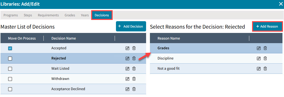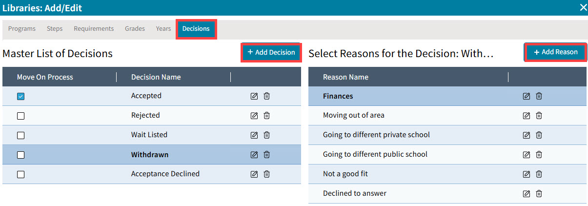 Each Decision can have one or multiple Reasons set up to help the school track why a prospect is not moving on in the process. This helps with statistical reports.