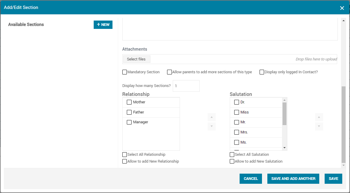 - Select the Allow to add New Relationship check box or the Allow to add New Salutation check box to allow parents to enter a new relationship or salutation.