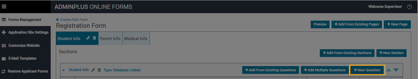 - On the section, click +New Question.