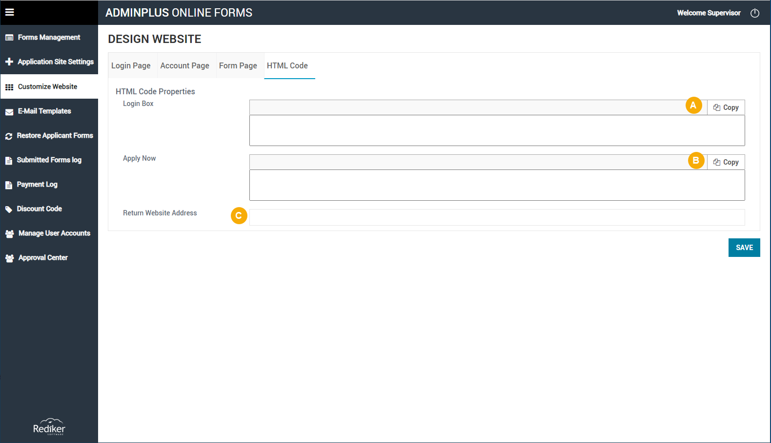 CType the URL for the website you want users to return to when they log out of AdminPlus Online Forms. - In the lower-right corner of the page, click Save, and then click OK.