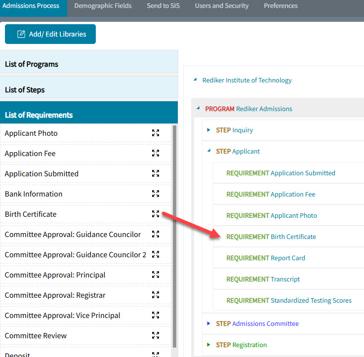 to expand the school, program, and step you want to add the requirement to. If the step does not have an arrow, click the step. - Click List of Requirements.