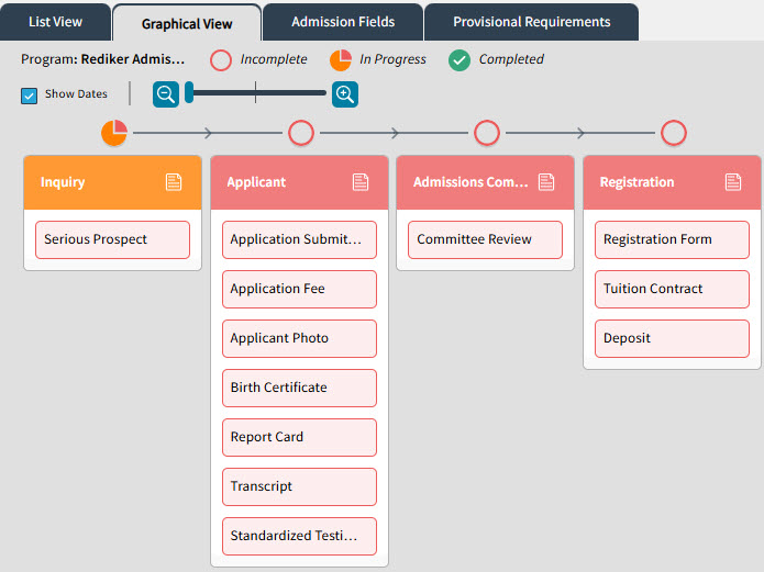 Once you have set up your Admissions Process, the Steps and Requirements will be displayed for each Prospect on their Admissions workflow screen (viewable in List or Graphical View - shown here):