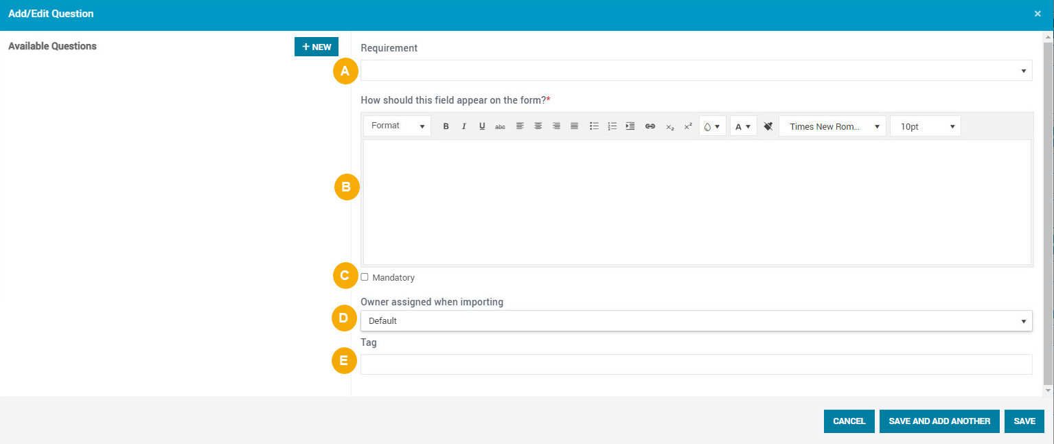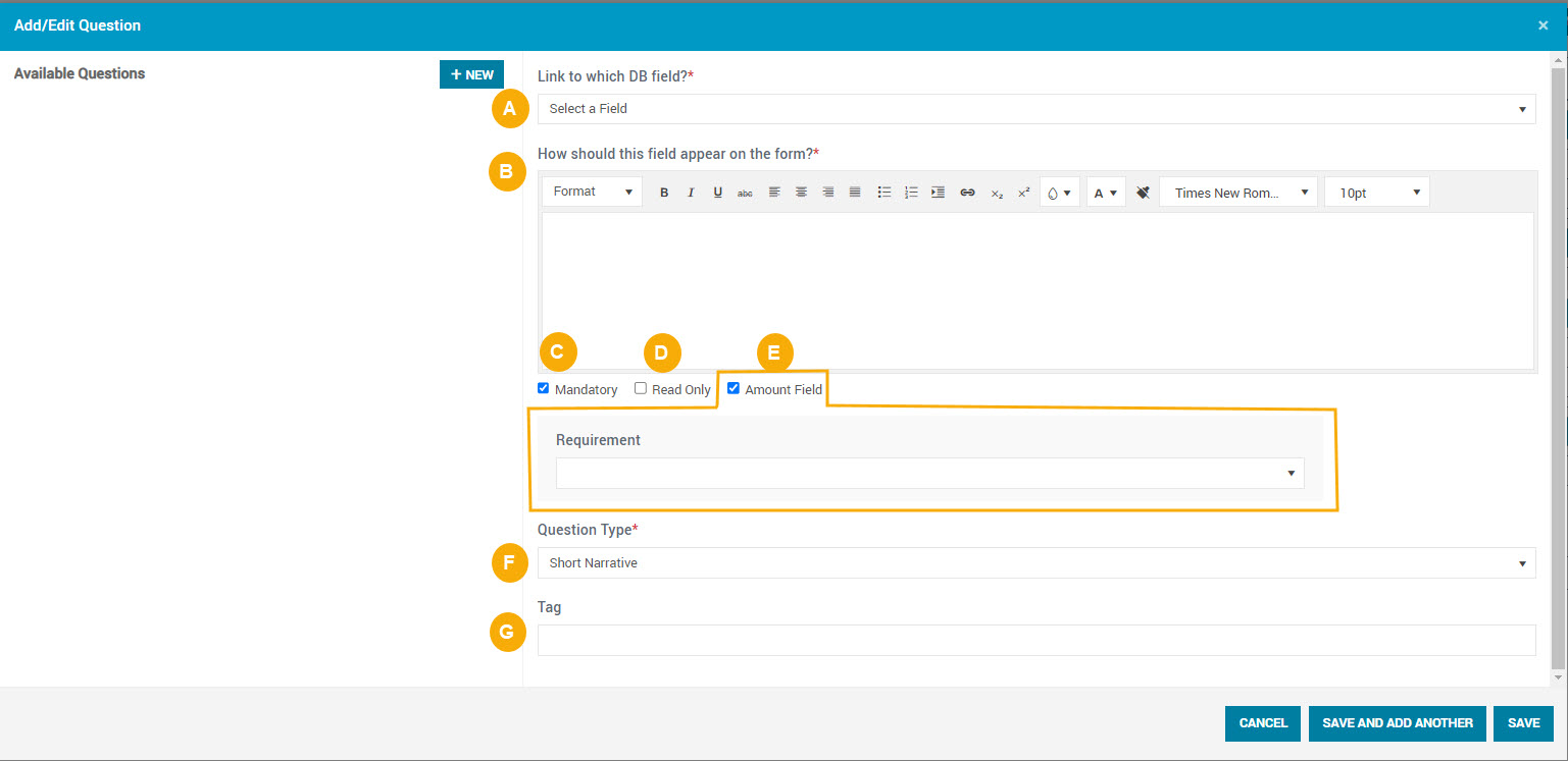 - Click Save to save your changes and close the dialog box, or click Save and Add Another to save your changes and add another question.