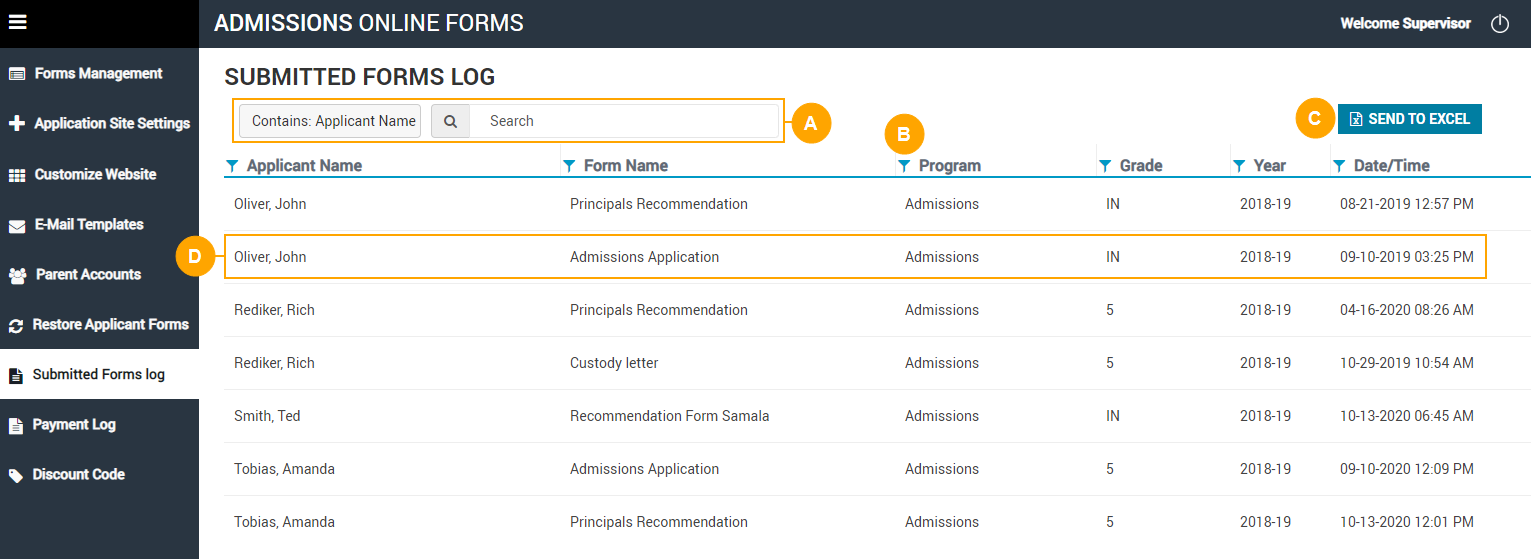 D | For each submitted form, view the applicant's name; form type; program, grade level, and school year being applied to, and date and time of the submission. |