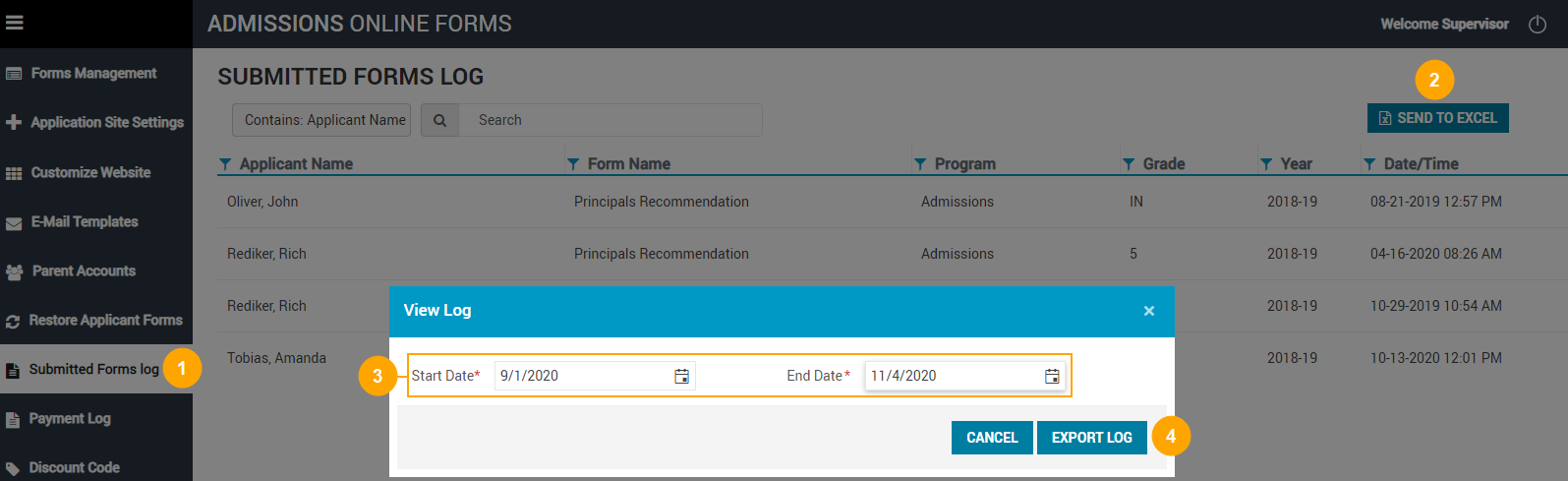 to select a Start Date and End Date for the range of dates for which you want to export submitted forms. - Click Export Log.