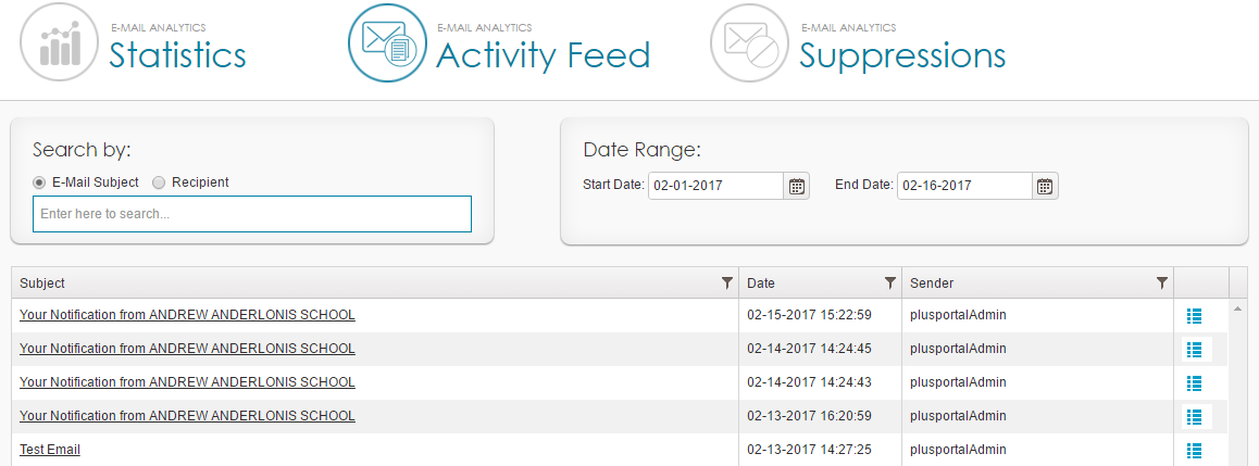 You can view the e-mails sent from PlusPortals during a selected date range, the intended recipients of the e-mail, and the status of each e-mail.