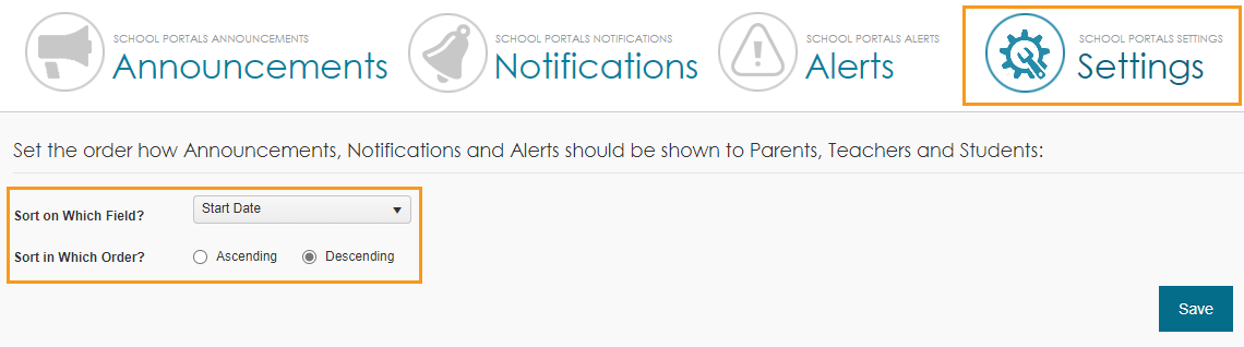 On the Settings tab, you can set the sort order for how announcements, notifications, and alerts display to your users.