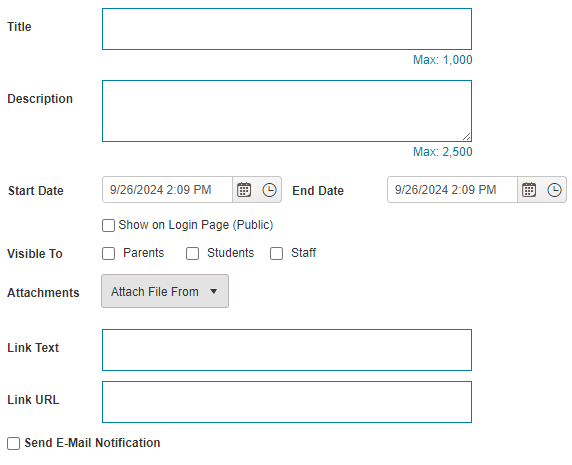 The process for creating an announcement, notification, or alert is almost the same. You can enter the dates for when the message is visible, select which user groups can see it, attach a file, add a link, and choose to send an immediate e-mail notification.