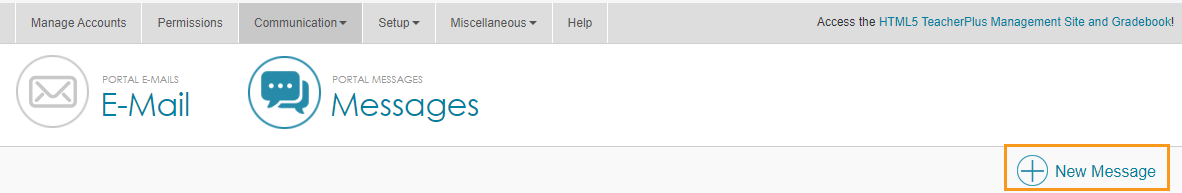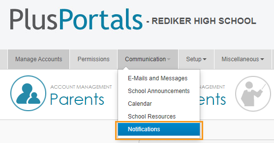 There are three options for mass communication in PlusPortals: announcements, notifications, and alerts. They are accessed by clicking Communication > School Announcements.