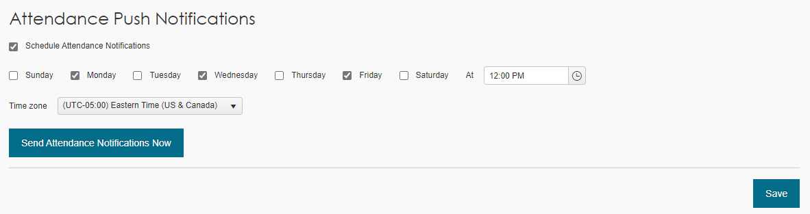- Under Attendance Push Notifications, select the Schedule Attendance Notifications check box.