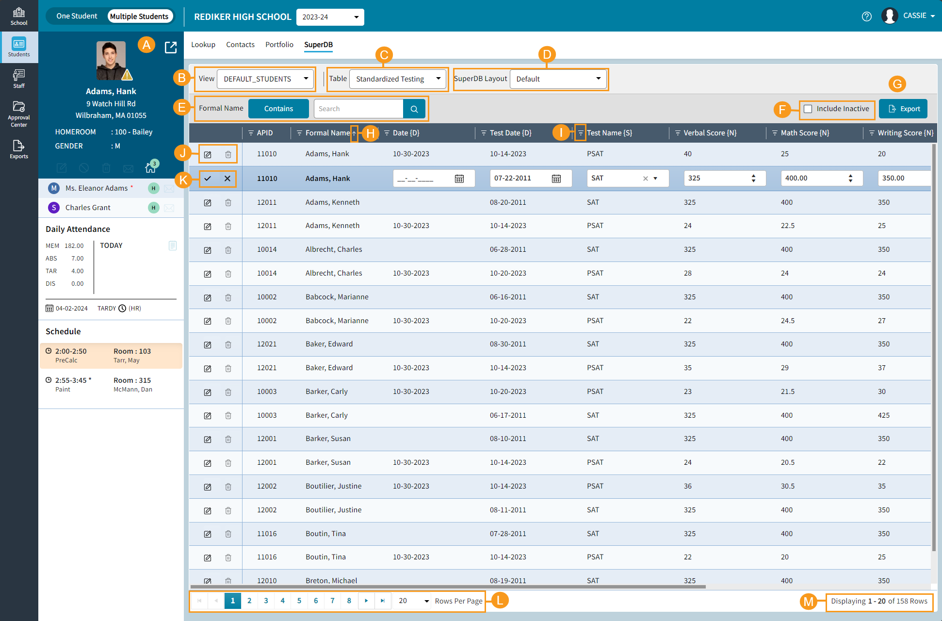 For more information about the features of the Multiple Students SuperDB screen, refer to the diagram and table below: