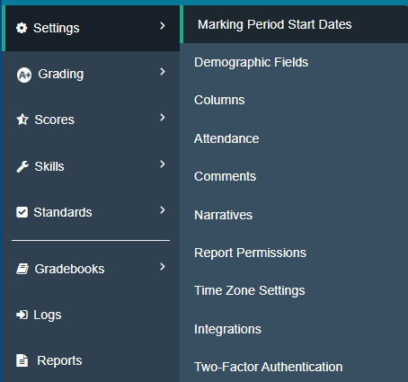 The gradebook Settings control some defaults and determine if certain features will be available or used by the teachers. For example, setting the Marking Period Start Dates, the visibility of Demographic Fields, which Attendance Codes teachers can use, whether the Google Classroom integration is enabled, etc.