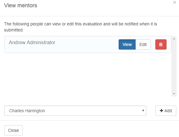 You can add a mentor to an evaluation you are working on, giving that user permission to either view or edit the evaluation. The user is notified when they're added as a mentor, when the evaluation is submitted, and when a signature is added to the evaluation.