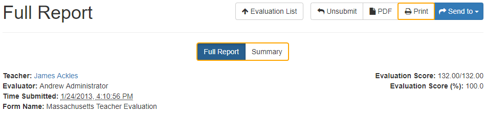 You can print the full evaluation or a summary of the evaluation. The summary doesn't include descriptions for standards and indicators, and it doesn't show indicators without at least one descriptor being selected.