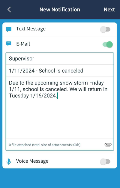 Using AP Notify in the AdminPlus Mobile App, you can send notifications to students, parents, and staff via text, voice, and e-mail. To compose and send a notification, do the following: