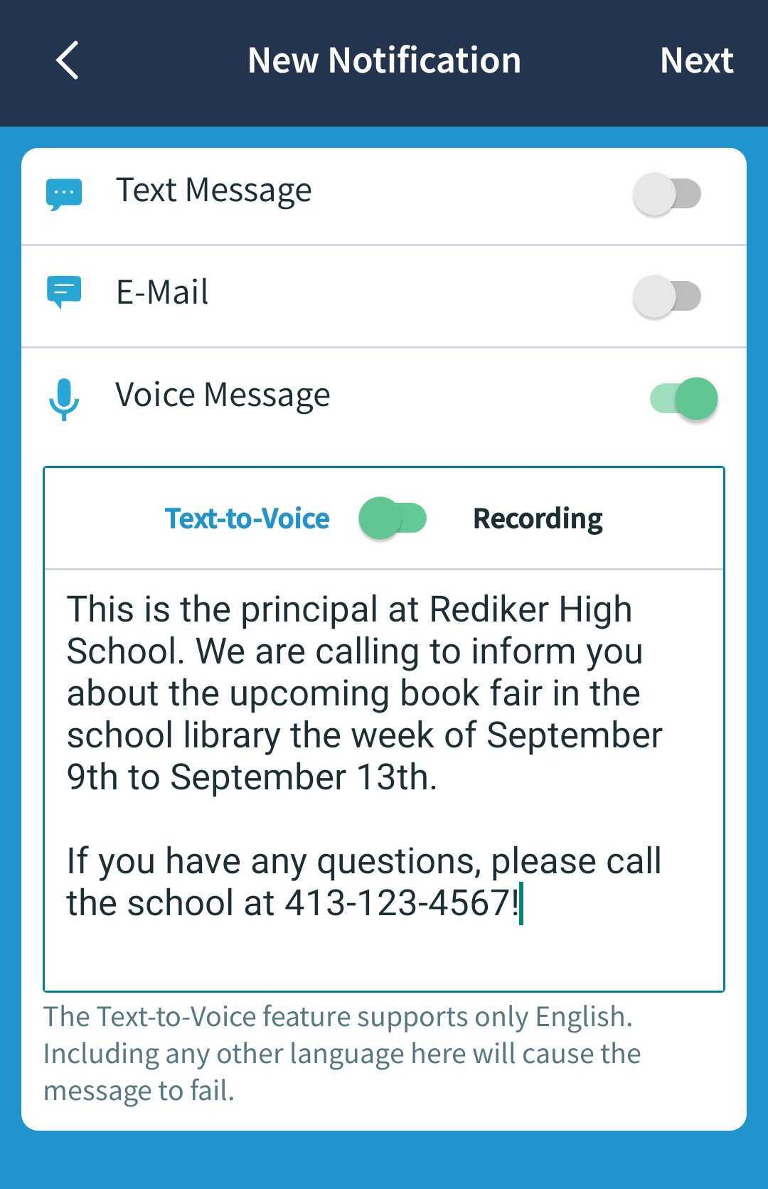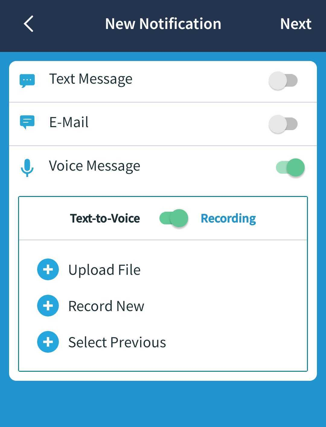 Voice MessageTap the toggle switch to choose Recording or Text to Voice.