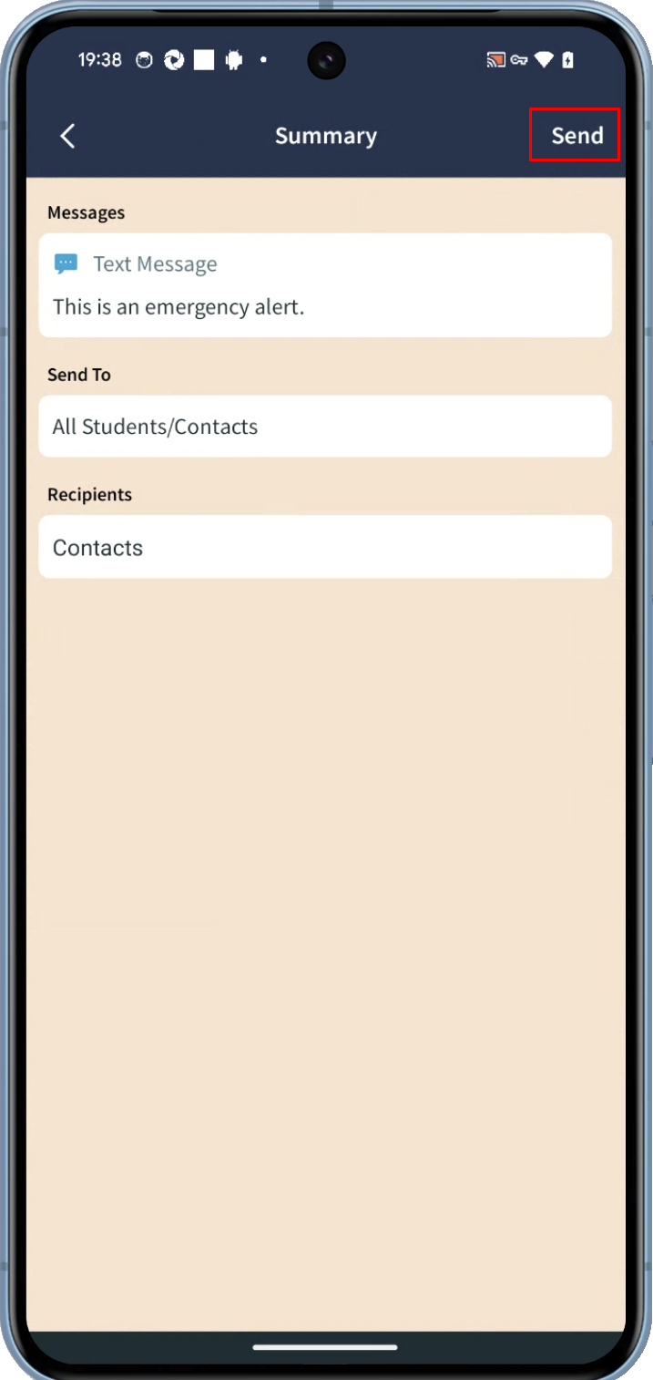 After enabling Emergency Mode, you can opt to send a Text Message, Voice Message, Email, or all three adhering to the previously mentioned restrictions. See Compose and Send a New Notification for more information about sending messages. Once the messages have been entered, select Next. See Send a Notification for more information on how to add recipients. The Summary page opens. Confirm the messages entered and the recipients selected are correct. As a reminder, the option to Send Later will not be available. Click Send to send the message immediately.