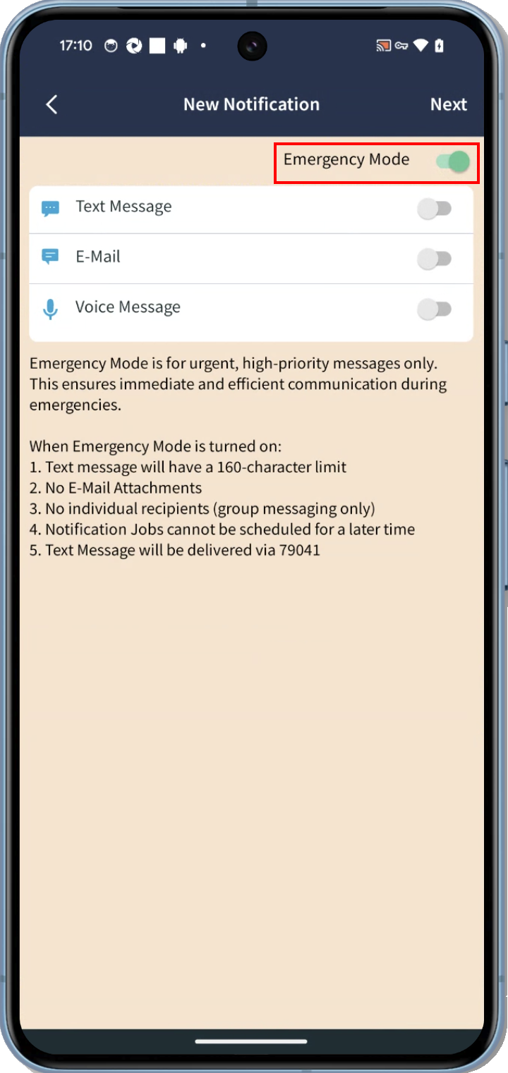 When choosing to send a message set as Emergency Mode, the following restrictions apply: