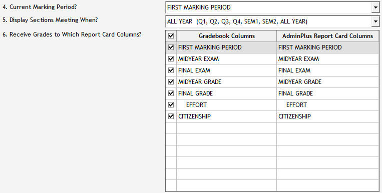 - In the Gradebook Columns list, select the check box(es) next to any column(s) that you want to receive into AdminPlus.