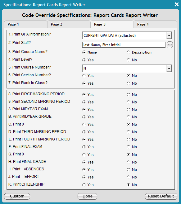 Generate and print a transcript for students in each grade, and customize the report to display a specific number of previous years. The Report Cards Report Writer has many extensive specifications you can use to configure the transcript. For instance, you can choose which columns to include as well as which dates the transcript will display, among various other options.