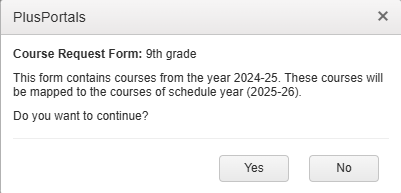 - A message will appear stating that the courses appear from the year XXXX-XX. These courses will be mapped to the courses of the schedule year (XXXX-XX). Do you want to continue. Select Yes to continue.