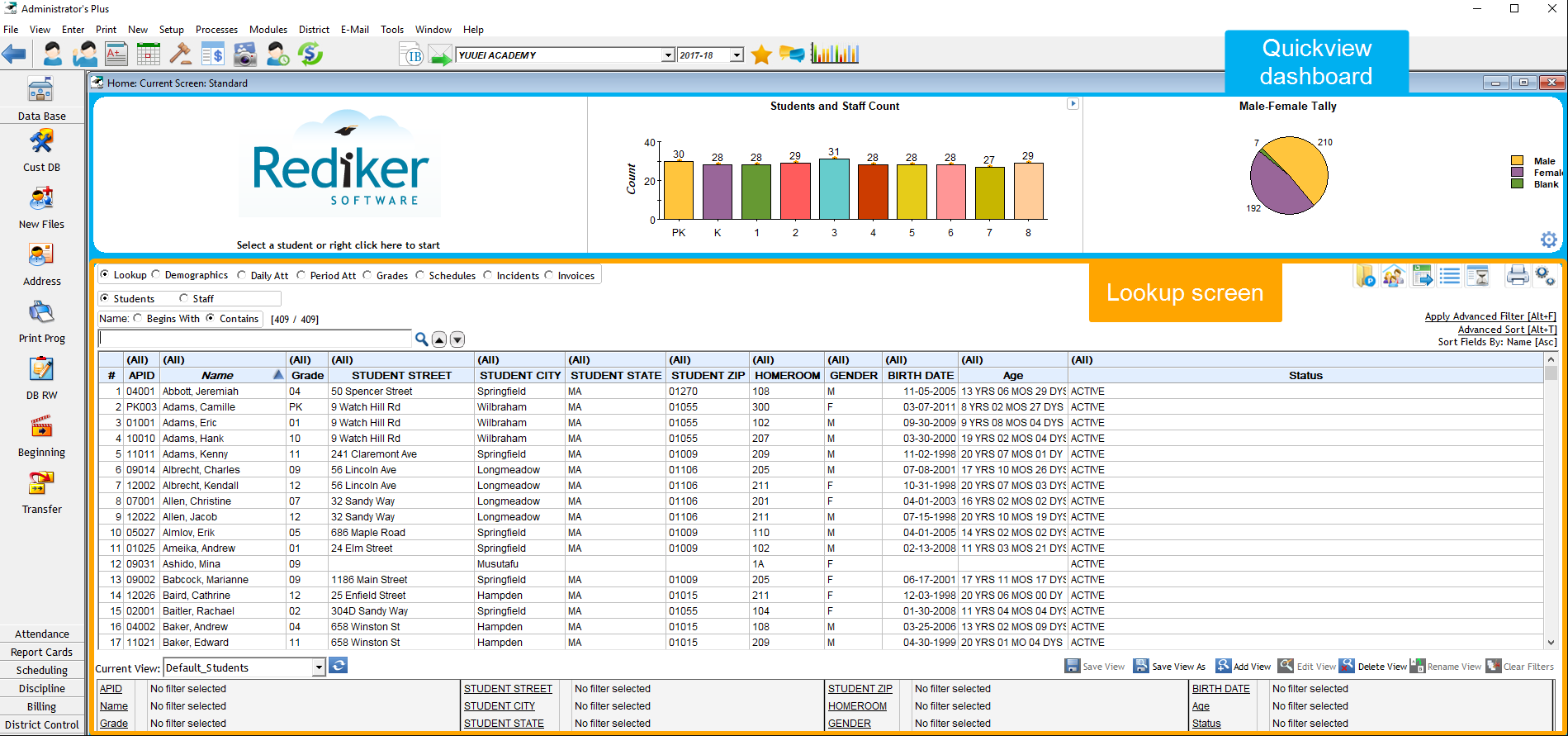 You can view information about your students, staff members, and school on the Home screen. By default, the Home screen displays the Quickview Dashboard and the Lookup Screen.