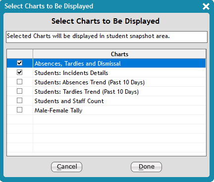 - Select the check box for the two charts you want to display on the Quickview dashboard.