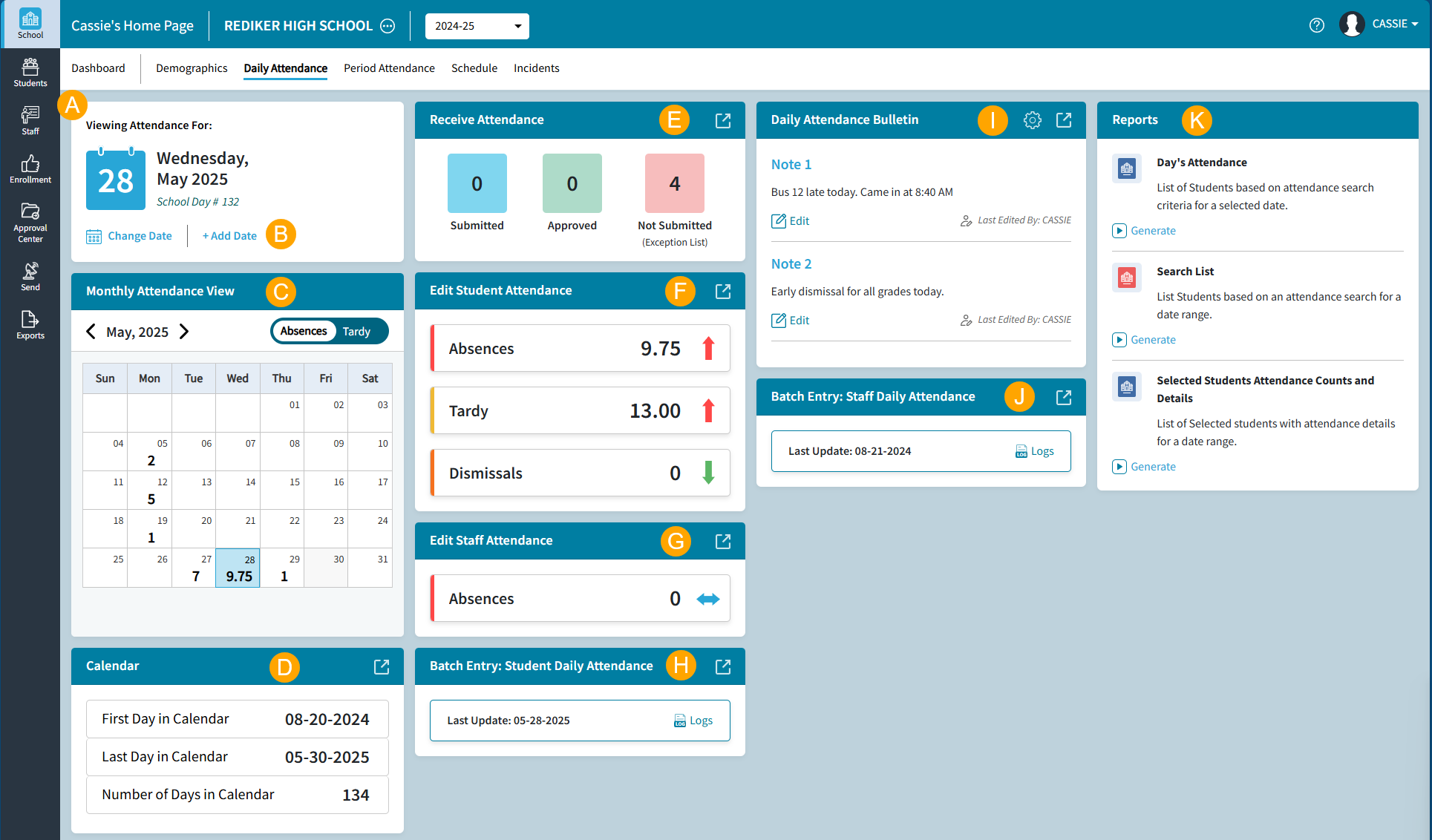 E | Receive Attendance displays the counts for Homeroom attendance Submitted from TeacherPlus Gradebook, the number Approved for the day, and the number Not Submitted. Click on the expand icon Receive Attendance on the Daily Attendance Dashboard is the same as Approval Center Daily Attendance. The School > Daily Attendance dashboard is used to receive Daily Attendance from Teacher Plus, edit Daily Attendance, and view Daily Absent and Tardy totals. |