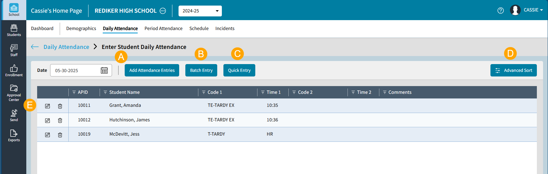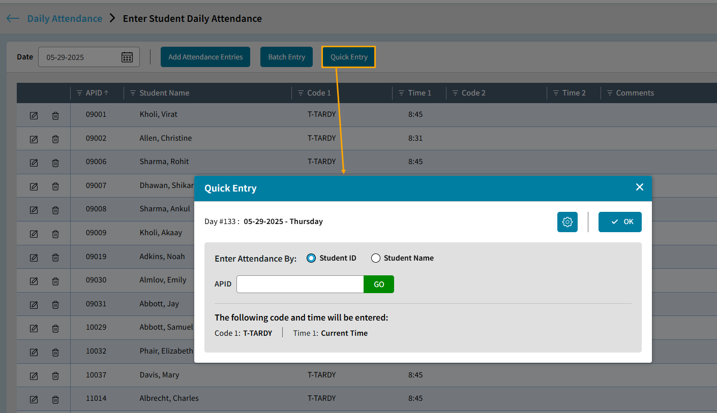 BSelect Batch Entry to batch enter attendance data for students. See Batch Entry for more information. CQuick Entry allows you to enter attendance by Student Name or Student ID. The same code and time will be entered for each student added.