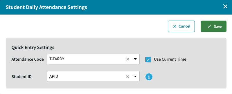 - Check off Use Current Time if you would like the current time entered at the time the attendance entry is entered to be added.