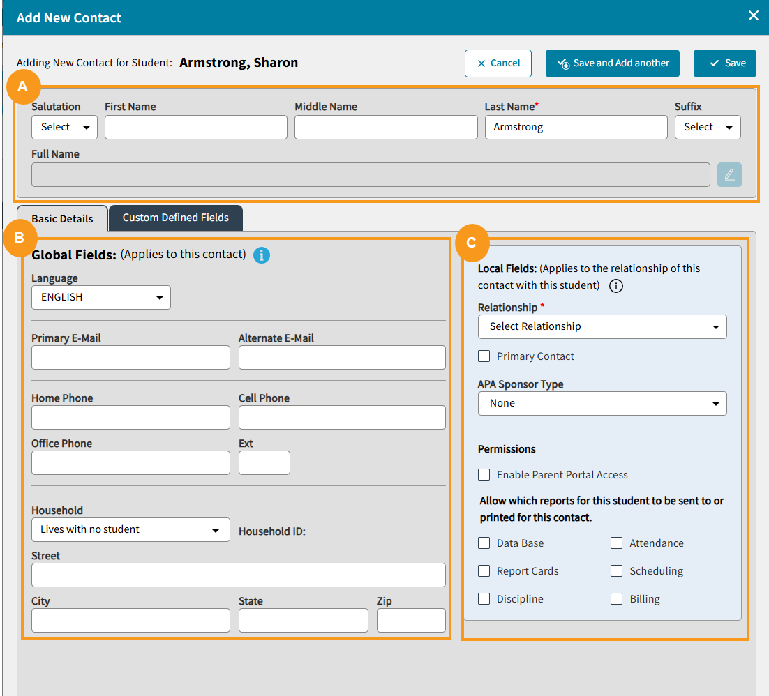 B | Basic Details Global Fields: The details entered on the left are considered Global Fields. This is because they remain the same for the contact regardless of the student the contact is connected to. Global fields contain the following: