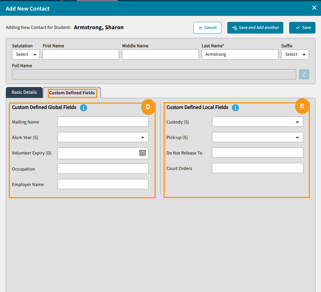 D | Custom Defined Global Fields: The fields viewed on this tab are custom fields defined by the school. These fields will remain the same no matter which student this contact is linked to. |