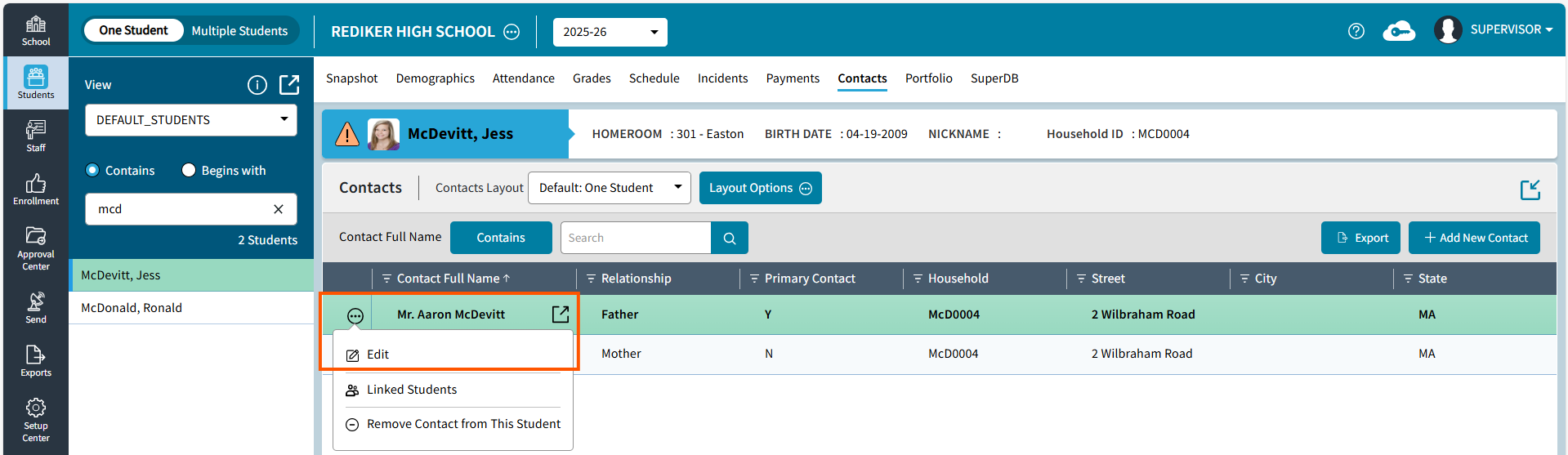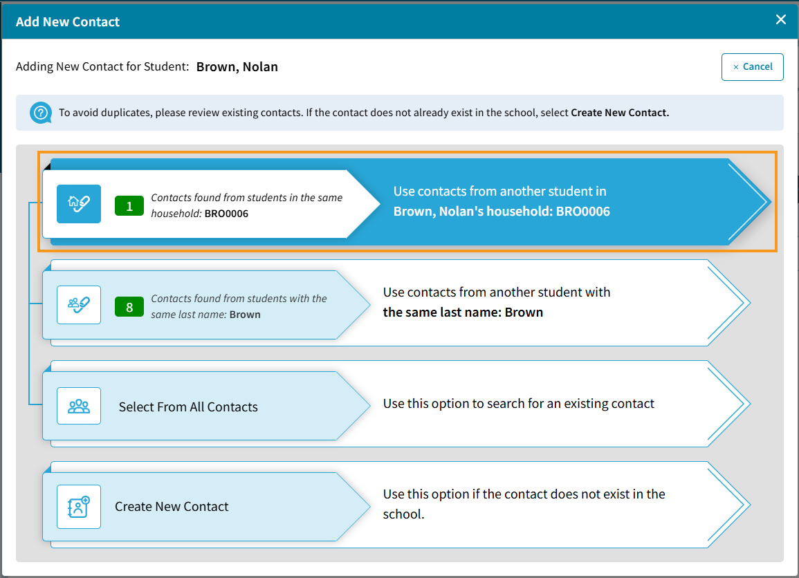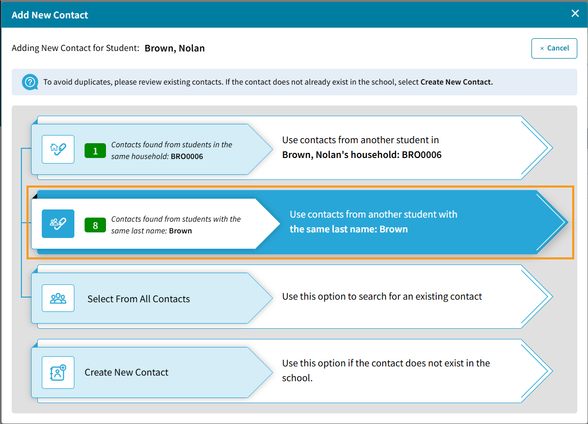 - Contacts found from students with the same last name: When selected, contacts of other students with the same last name will display.