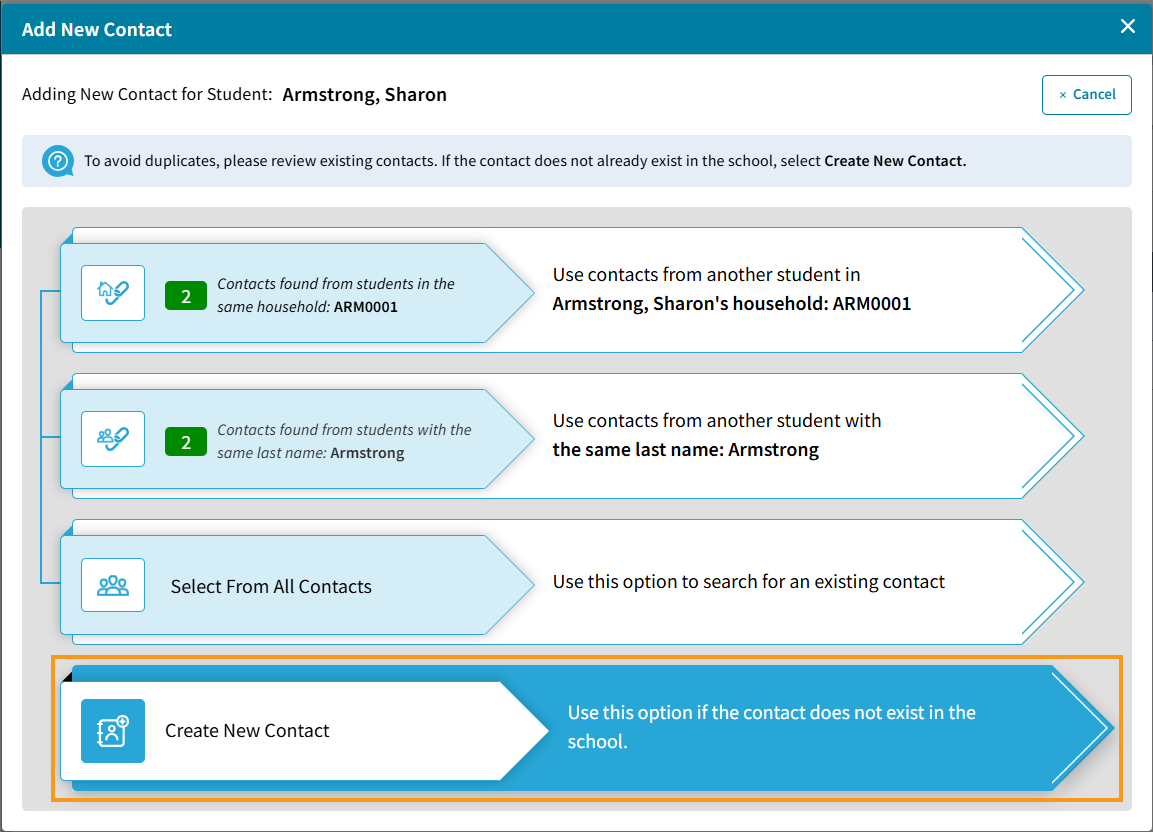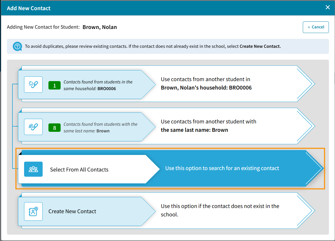 - There are three different ways to add an existing contact to a student. Choose one of the following options: