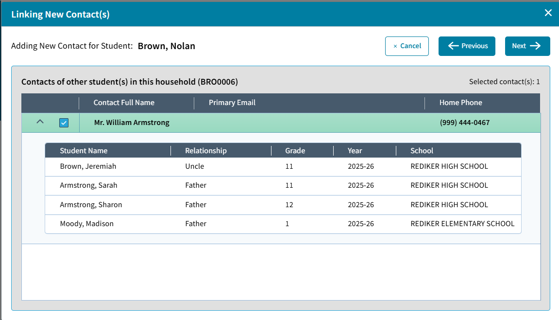 Linking New Contact screen will display Contact Name, Primary Email Address (if used in search), Home Phone number and linked student's Name, Relationship to Student, grade, year, and school.