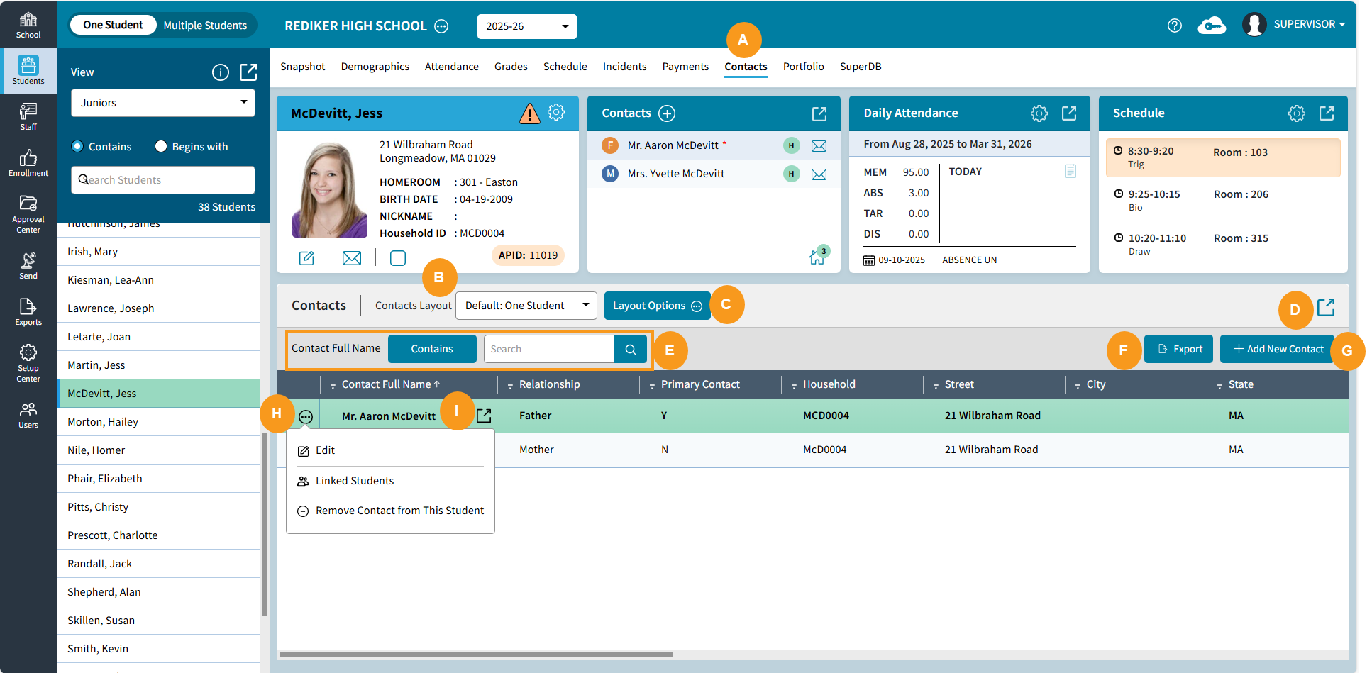 The Contacts condensed view keeps the top tiles (Profile, Contacts, Daily Attendance, and Schedule) in view and displays Contacts in table format underneath. Please refer to the diagram and table below for additional information about the features of the Contacts screen: