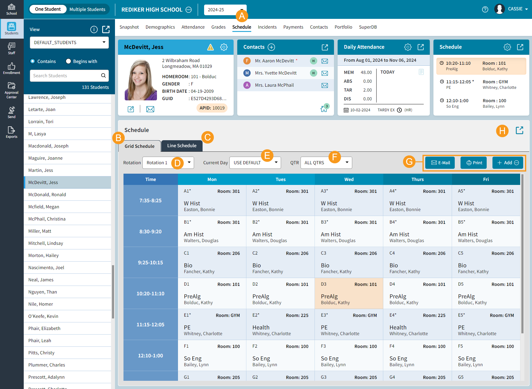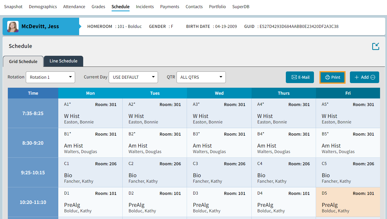 From either the Grid or Line Schedule you can choose to e-mail an individual student schedule. Select