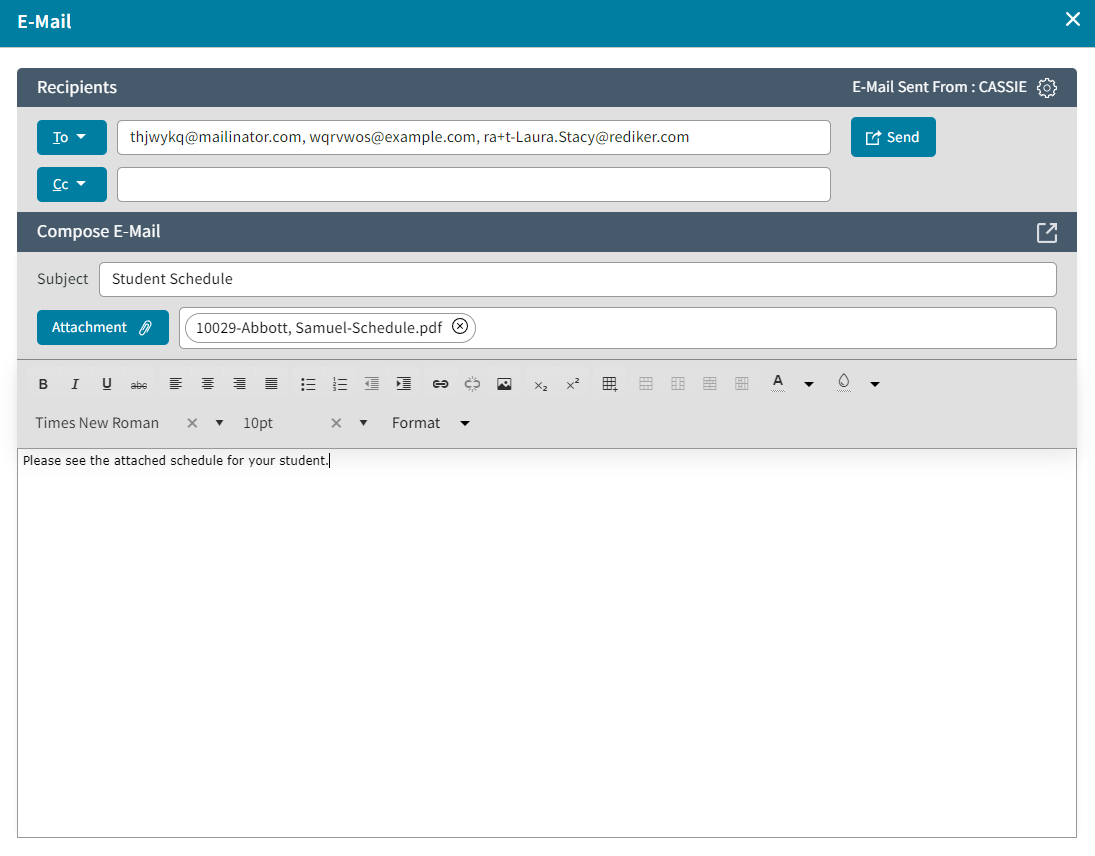The Print settings will determine what is included on the PDF attachment included in the E-Mail. Be sure to set these print settings prior to e-mailing a student schedule.