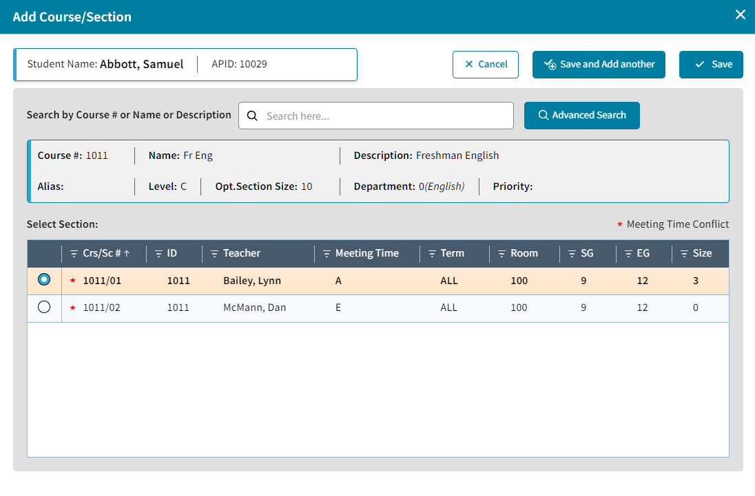 - Course/Section: This option allows you to add a new course and section to a students schedule. This means the student has been added to a course as well as a section with a teacher.