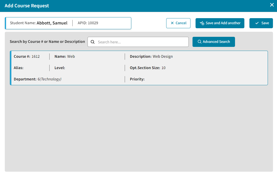 - Course Request: This option can be used to add a course to a students schedule, without scheduling them into a section.