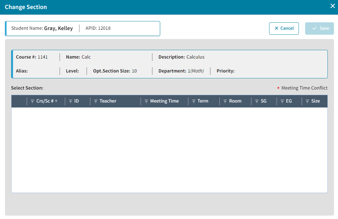 If no other sections exist for the selected course, the Select Section portion will be blank: