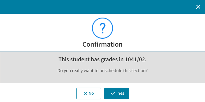 - If the student has grades in AdminPlus or TeacherPlus Gradebook for the course you choose to Unschedule, the following message will appear. Select Yes to unschedule. Choose No to keep the course.