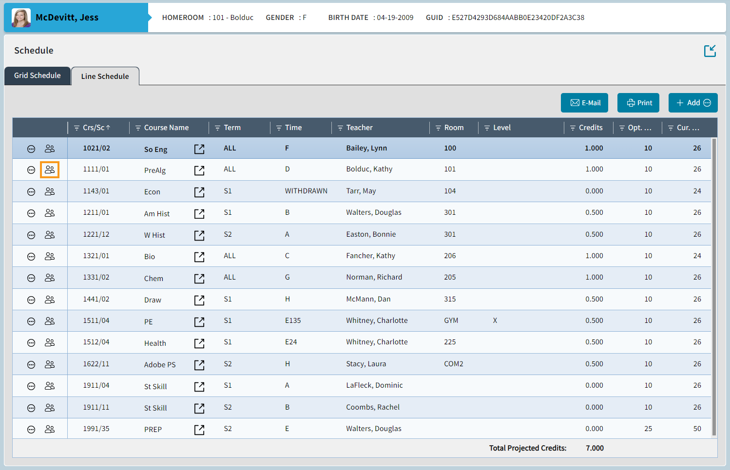 C | Select the Line Schedule tab to view the schedule in a table format. Select to view the roster for the selected course. The E-Mail, Print, and Add are also available.The Line Schedule has the following course information