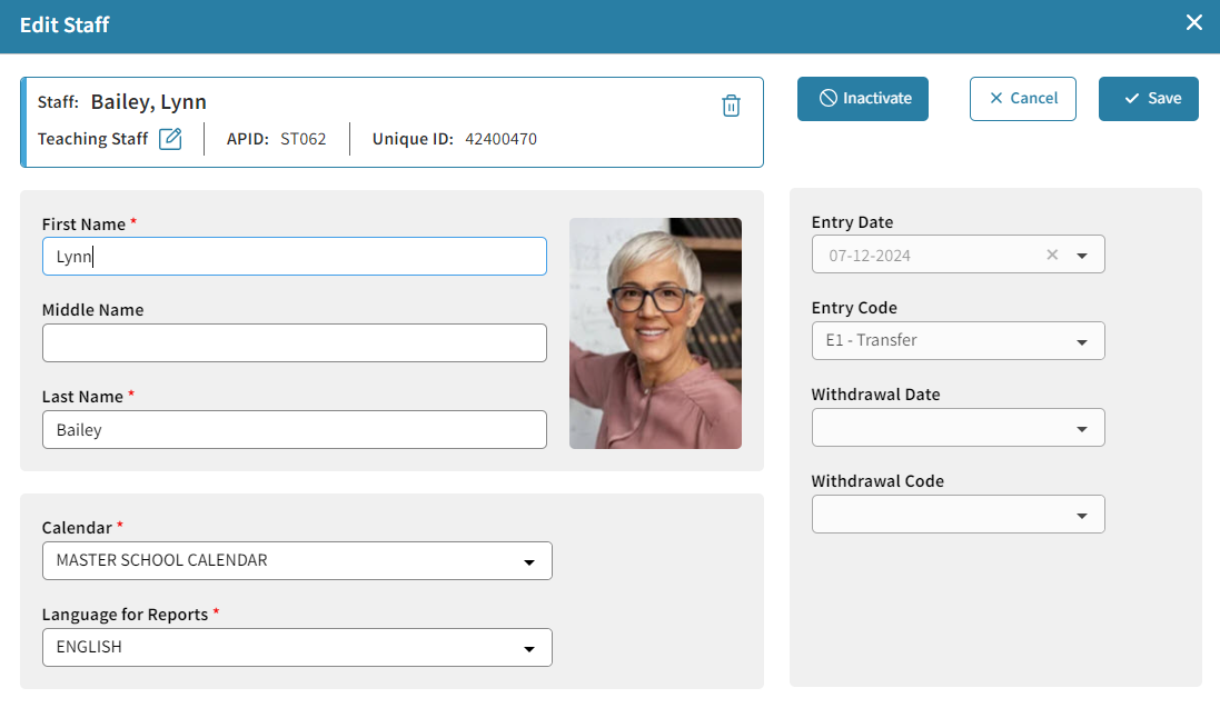To edit a staff profile including information such as if they are Teaching or Non-Teaching Staff, Name, Calendar, and Primary Language, or to inactivate a staff member, select the edit icon
