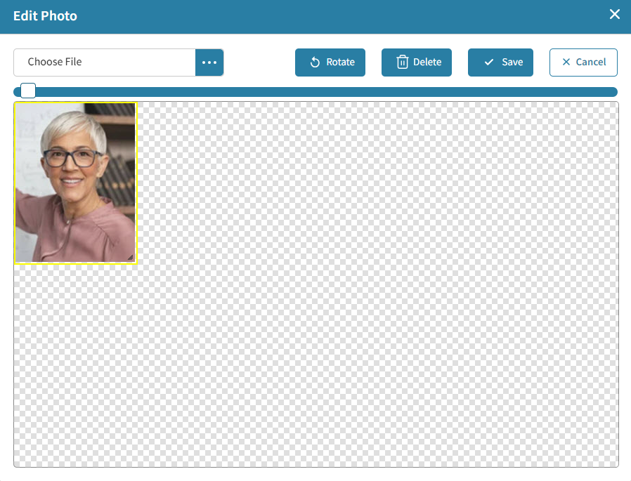 B | Staff First, Middle and Last Name are entered and can be updated here. Users can add a new or edit an existing photo by hovering over the staff photo. Select the Edit icon that appears. This will open the photo editor. You can crop or resize the image, delete the current photo, or upload a new staff photo.![]() Maximum photo size is 1 MB. ![]() |
