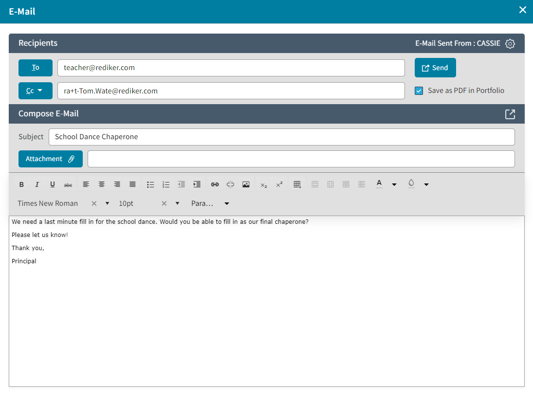 - Select To and choose which recipients to send the E-Mail to. On default, the E-Mail is sent to the Staff member, but you can choose to CC other Staff or Admin Users.