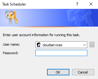 - Select Ok to save your changes. If the user you selected to have the task run under is not currently logged in, you will be prompted to enter the password.