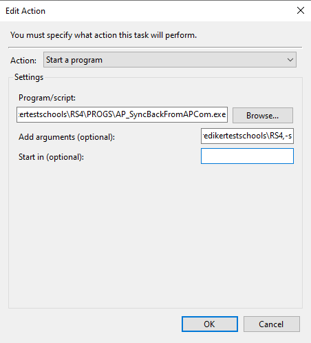 - In Program/script, enter the UNC Path of where AP_SyncBackFromAPCom.exe is located.