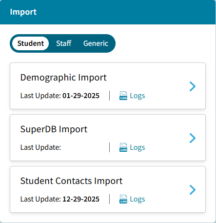- Student Demographic Import: Update existing Student data using a CSV (Comma-delimited) or TXT (Tab-delimited) file. Select Logs to view the logs for past imports. For more information see Student Demographic Import.